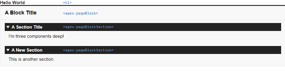 - 각 Visualforce tag는 페이지 섹션, list view, 개별 필드와 같은 인터페이스 구성 요소에 해당